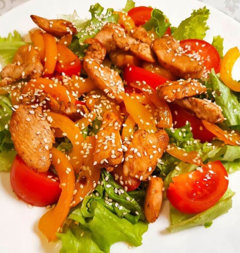 Подаем к столу прекрасный горячий салат с жареной курицей и перцем.